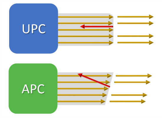 Коли два роз'єми UPC з'єднуються, відображення направлено прямо через серцевину волокна до джерела. Однак похилий торець роз'єму APC змушує більшу частину відбитого світла нахилятися та поглинатися оболонкою, що оточує серцевину волокна. У той час, як гарний одномодовий роз'єм UPC буде мати значення -50 дБ або нижче, одномодовий роз'єм APC зазвичай має значення -60 дБ або нижче. Тому підключення APC часто використовується у волоконних додатках, які сприйнятливіші до відображення. (Докладніше про підключення волокна APC.)