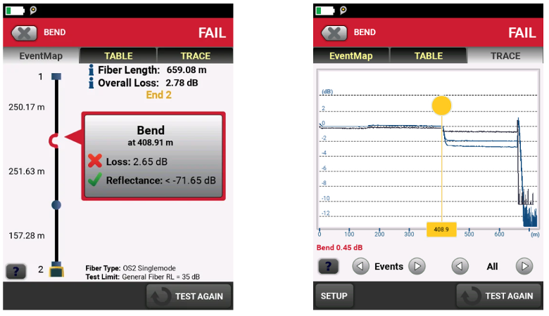OTDR відображає відбите і назад розсіяне світло у вигляді траси, що графічно відображає характеристику волоконної лінії. Досвідчені користувачі OTDR зазвичай можуть розпізнавати події для шнурів запуску, роз'ємів, механічних зрощування, зварних зрощень, невідповідних волокон і кінця лінії зв'язку. Однак не всі є експертами щодо аналізу трас. OptiFiber Pro має розширену логіку, яка автоматично інтерпретує трасу та надає «EventMap», яка вказує місце розташування та відбивну здатність роз'ємів, зрощування та аномалій. (Докладніше про пошук та усунення несправностей волокна, включаючи OTDR, у нашій білій книзі «Пошук та усунення несправностей волокна».)