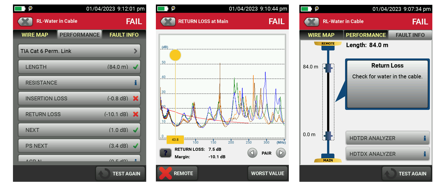 Коли поворотні втрати відбуваються в одній частотній точці, а решта частот проходить із запасом, це зазвичай вказує на проблему з кабелем. Як правило, коли всі чотири пари виходять з ладу (особливо на нижчих частотах), це може вказувати на неякісний кабель або наявність води в кабелі. Інтерпретація частотних графіків відмов зворотних втрат потребує значних знань, але ця здатність включена у функцію «Інформація про несправності» у DSX CableAnalyzer. (Дізнайтеся більше про те, як вимірювати та тестувати зворотні втрати в мідних системах.)