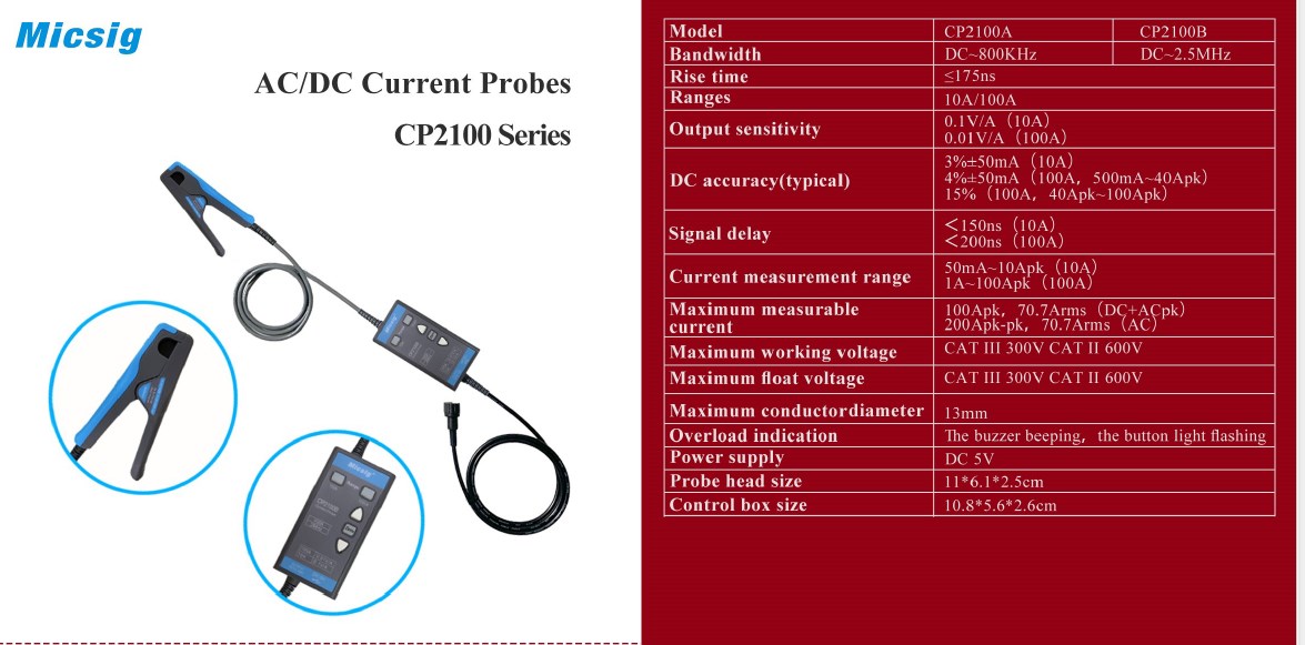 Компанія MICSIG оголосила про доступність замовлень на нову розробку струмових пробників. У порівнянні з аналогічною продукцією від провідних світових виробників зі США та Європи (наприклад, Tektronix A622), вартість струмового пробника від MICSIG менша на 50%, при тому, що якість виконання та специфікації пробників СР2100А/2100В істотно вища, що добре видно з представленої нижче таблиці: