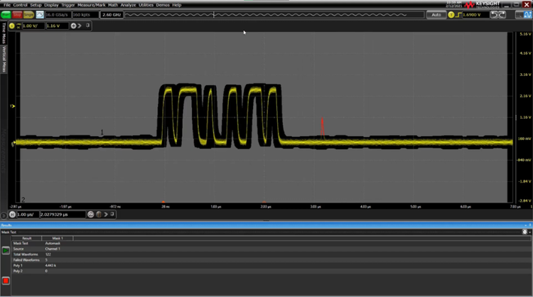• Багатоканальне тестування — можливість тестування маскою на всіх каналах одночасно стане в нагоді, коли ви аналізуєте кілька точок схеми, наприклад, мікросхему живлення під час послідовного її включення.