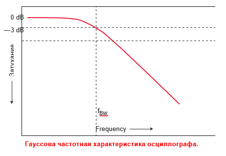 Звичайно ж, такий підхід допомагає зрозуміти частотну складову сигналу, що вимірюється. Всі осцилографи мають низькочастотну характеристику, яка спадає на більш високих частотах, як показано на малюнку 1. Більшість осцилографів зі смугою пропускання 1 ГГц і нижче зазвичай мають частоту гаусса частотну характеристику, яка співвідносить характеристики однополюсного низькочастотного підсилювача і прохідний фільтр.