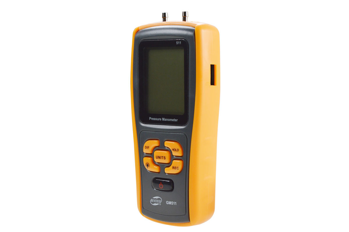 GM511 диференціальний манометр виробництва компанії Benetech . Даний цифровий дифманометр призначений визначення різниці значень тиску в діапазоні: ± 10 кПа . Особливість даної моделі полягає у високій чутливості приладу, що забезпечує високу швидкість вимірювання: 0,5 сек., і точність: ± 0,3 % FSO. Також варто відзначити функцію індикації перевищення діапазону як позитивних, і негативних вимірів. Цифровий дифманометр Benetech GM511 реалізований у пластиковому корпусі, і поставляється з прогумованим протиударним чохлом, живлення здійснюється чотирма елементами живлення типорозміру "ААА" 1,5 В. Завдяки USB-інтерфейсу диференціального манометра GM511 дані вимірювань можуть передаватися на аналізи можуть передаватися на вимірювання.