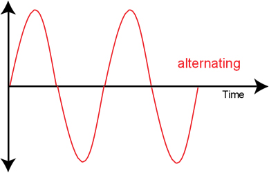 Змінний струм набуває форми синусоїдальної хвилі, при цьому напруга з часом змінюється від позитивного до негативного.