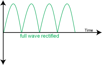 У першому етапі процесу напруга випрямляється з допомогою набору діодів. Випрямлення перетворює синусоїдальний змінний струм. Випрямляч перетворює синусоїдальні хвилі на серію позитивних піків.