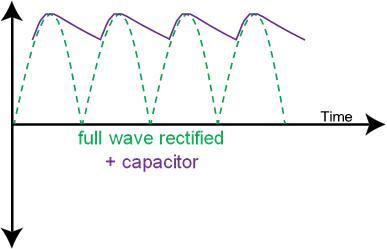 Після випрямлення напруги у формі сигналу все ще залишаються коливання (час між піками), які потрібно усунути. Випрямлена змінна напруга потім фільтрується або згладжується конденсатором.