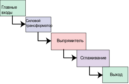 Джерело живлення бере змінний струм з розетки, перетворює його в нерегульований постійний струм і знижує напругу за допомогою вхідного силового трансформатора, зазвичай знижуючи його до напруги, необхідного навантаженням. З міркувань безпеки трансформатор також відокремлює вихідне джерело живлення від вхідної мережі.