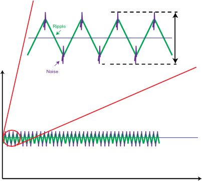 Шум та пульсація. Шум – це будь-які додаткові та небажані електронні перешкоди, а пульсація – це невелика зміна напруги при перетворенні змінного струму на постійний. Зазвичай вони поєднуються в один вимір. В імпульсних джерелах живлення виміри даються в розмаху, показуючи ступінь сплесків шуму, що виникають під час перемикання.