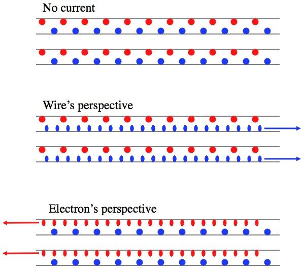 Таким чином, для електронів, що рухаються, інший провід здається має більше негативних зарядів, ніж позитивних, і тому вони відштовхуються. Позитивні ядра тягнуться у себе. Зверніть увагу, що я ніколи не згадав магнітне поле.