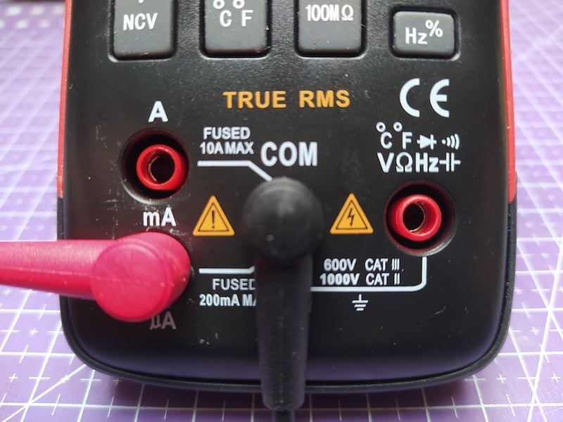 Більшість DMM мають два щупи, підключені до гнізд, один чорний і один червоний, що позначають позитивний і негативний полюси. У більшості випадків ваші щупи будуть підключені до 2 гнізд, позначених XXX, що означає, що DMM налаштований на вимірювання напруги та інших параметрів, але не струму, що вимагає підключення DMM до ланцюгів іншим способом, докладніше про це пізніше.