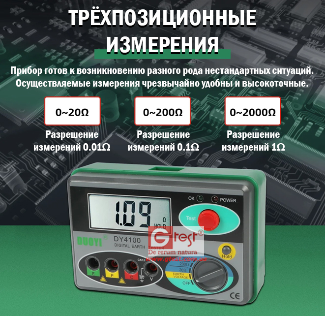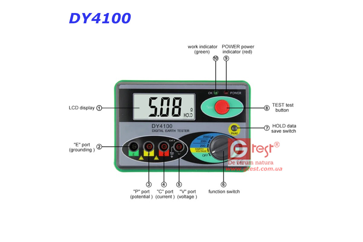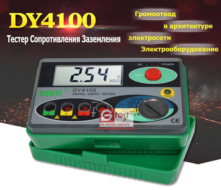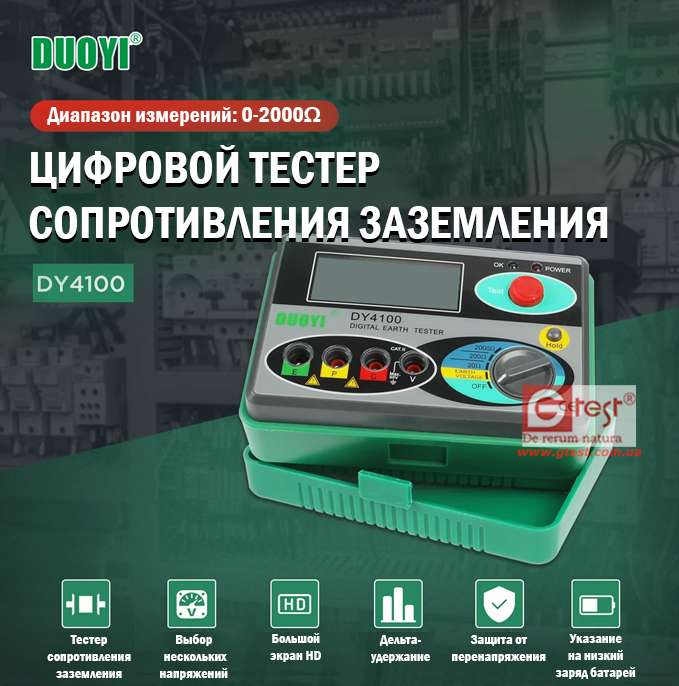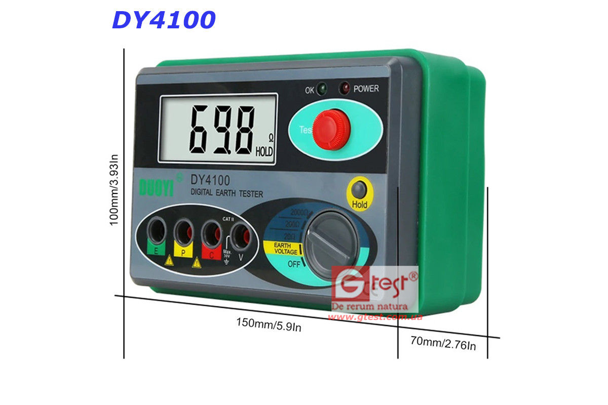 Цифровий тестер опору заземлення DY4100 є приладом нового покоління для електриків, розробленим компанією DUOYI в останні роки. Схема, структура та технологія традиційного вимірювача опору заземлення були покращені, а новий дизайн одночасно гарний та практичний. DY4100 має більш повні функції, більш високу точність, більш зручний та надійний в експлуатації та більше підходить для використання на відкритому повітрі завдяки пило- та вологонепроникній конструкції.