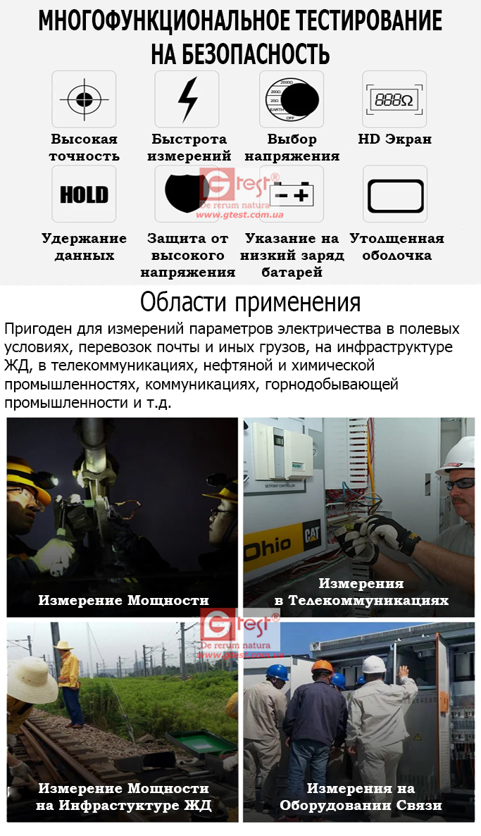Прилад здатний перевіряти опір різних систем заземлення, включаючи енергосистеми, електрообладнання, громовідводи, а також параметри провідника з низьким опором та тестування змінної напруги.