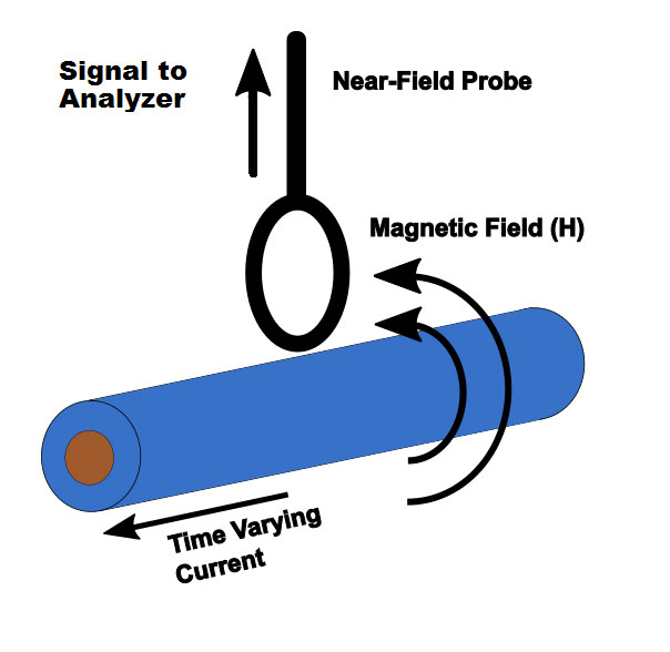 Пробники магнітного поля та струмові кліщі працюють за однаковим принципом. Магнітне поле проходить через «петлю» пробника та індукує напругу для вимірювання ( рис. 4 ). Велика петля захоплює більше магнітного потоку, що дозволяє знаходити слабші сигнали, але маленька петля забезпечує більшу точність у просторі. Більшість наборів поставляються з кількома петлями різних розмірів ( рис 5 ) для забезпечення ідеального балансу між чутливістю та просторовим дозволом. Пробники електричного поля немає області петлі. Вони вловлюють електричне поле за принципом однополярної антени. Зміна напрямку пробника електричного поля не така критична щодо пробника магнітного поля, але збільшення відстані до джерела значно відбивається на його чутливості.