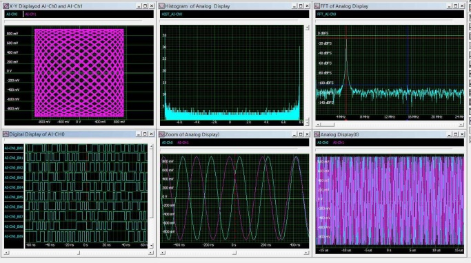 На малюнку 2 отримано два канали даних, які показані в правій нижній сітці. Горизонтальне розширення цієї траси показано у нижній центральній сітці. Верхня ліва сітка містить графік X-Y цих двох сигналів. Нижня ліва сітка містить цифрове відображення чотирнадцяти біт, що становлять сигнал на каналі 1. Швидке перетворення Фур'є (БПФ) сигналу з каналу 1 показано на правому верхньому дисплеї, а верхній центральний дисплей містить гістограму того ж сигналу. Як можна помітити, поєднання дигітайзера з SBench 6 забезпечує всі можливості відображення та аналізу осцилографа.