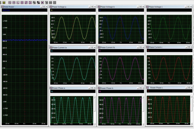 На малюнку 3 показані фазні напруги (Va, Vb і Bc), фазні струми (Ia, Ib і Ic) і потужність фази (Pa, Pb і Pc), що розсіюється, для навантаження, підключеної за схемою «зірка» (де у нас є доступ як до фазного, і до лінійному напрузі).