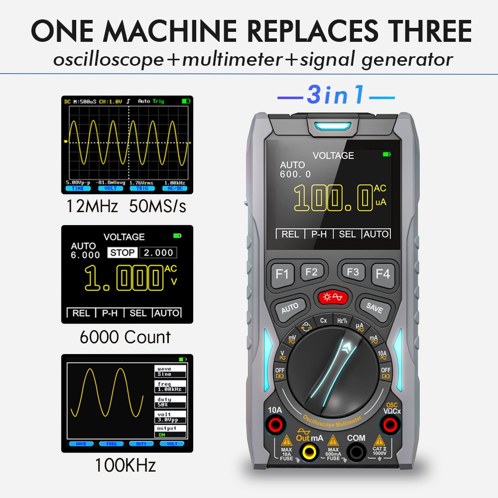 Осцилограф 3 в 1, 12 МГц, 50 МГц, частота дискретизації, 2,4 дюйми, кольоровий екран, автоматичний мультиметр, генератор сигналів, сховище даних. Один прилад замінює відразу 3 інструменти