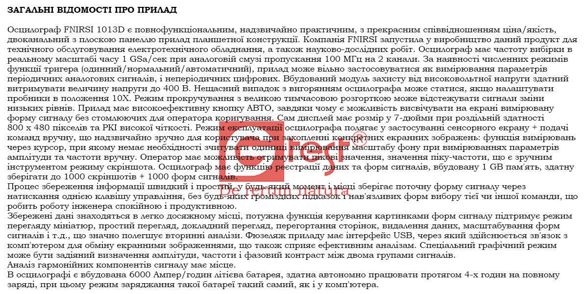 Осцилограф FNIRSI має заявлені: 1).частота дискретизації в реальному масштабі часу до 1GSA/S 2).аналогова смуга пропускання 100 МГц * 2 (каналу). Осцилограф FNIRSI має повну функцію запуску/тригера (одиночний/нормальний/автоматичний), прилад можна вільно застосовувати як для періодичних аналогових сигналів, так і аперіодичних цифрових.