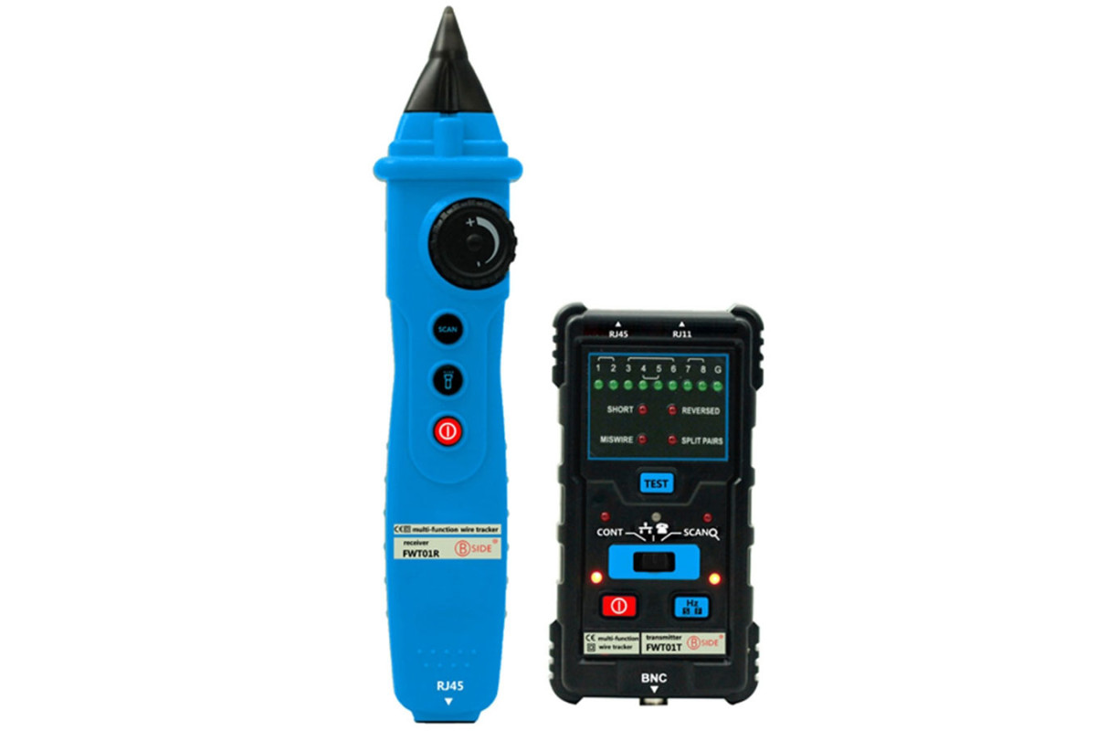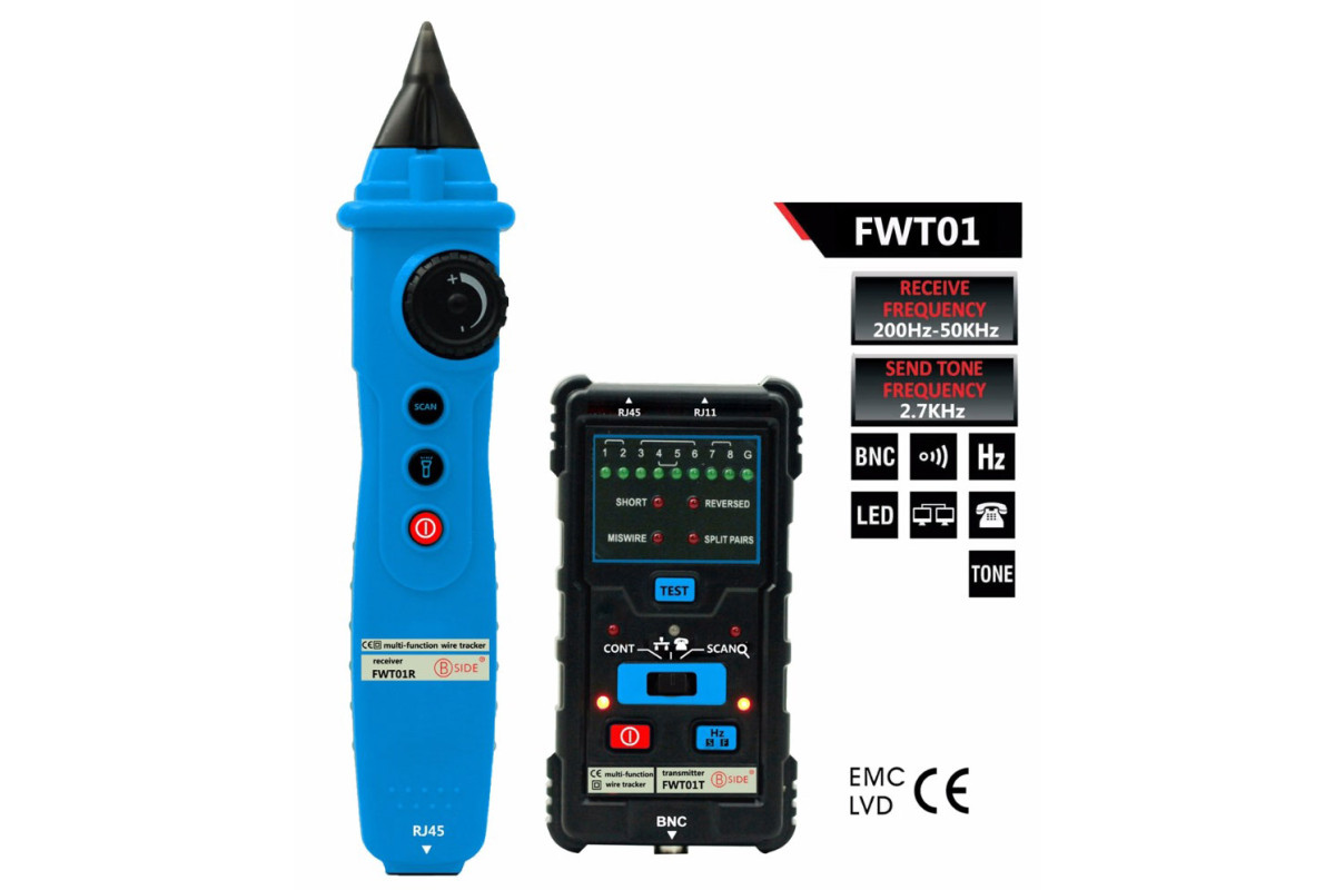 FWT01 Багатофункціональний трасошукач. Даний трасошукач складається з двох приладів: генератора-передавача та приймача. Принцип роботи FWT01 полягає в детектуванні електромагнітного поля, створюваного генератором навколо провідника, що тестується. Основним призначенням даного трасошукача є локалізація: прихованої проводки, урвищ та короткого замикання кабелів комунікацій без пошкодження ізоляції. Крім роз'ємів RJ11 і RJ45, багатофункціональний трасошукач FWT01 оснащується адаптером із затискачами типу "крокодил", що дозволяє тестувати не тільки кабелі стандартів комунікаційних мереж, а й окремі провідники. Для роботи в умовах недостатнього освітлення даний трасошукач оснащений світлодіодним підсвічуванням.
