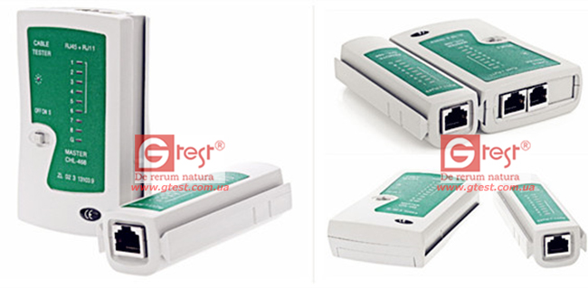 Нижче показано зображення мережевого кабелю. Він складається з базового тестера (також званого головним тестером) та віддаленого тестера. На передній панелі у них завжди є нічне підсвічування. Крім того, більшість тестерів мають два або три роз'єми: RJ-45 для Ethernet, RJ-11 для телефонного кабелю і BNC для коаксіального кабелю. При тестуванні кабелю Cat5e два тестери з'єднуються кабелем Cat5e. І якщо кабель працює, індикатори на обох тестерах загоряться зеленим послідовно від 1 до G. Однак, якщо використовувати тестер для перевірки кабелю з роз'ємами RJ11, послідовність індикаторів, що світяться, буде іншою.