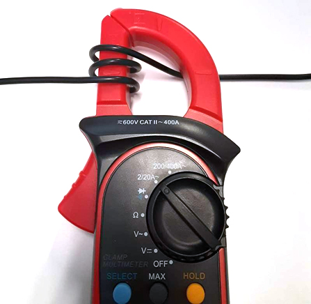 Проведення дроту через затискачі помножить показання струму, що дасть набагато краще показання. На цьому зображенні обов'язково розділіть отриманий струм /3, оскільки провід проходить через затискачі 3 рази.