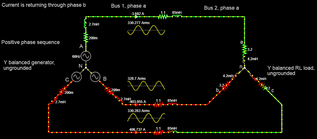 У верхньому лівому куті кожного GIF-зображення я вказую, через який фазний провідник лінійні струми повертаються від навантаження до джерела/генератора.