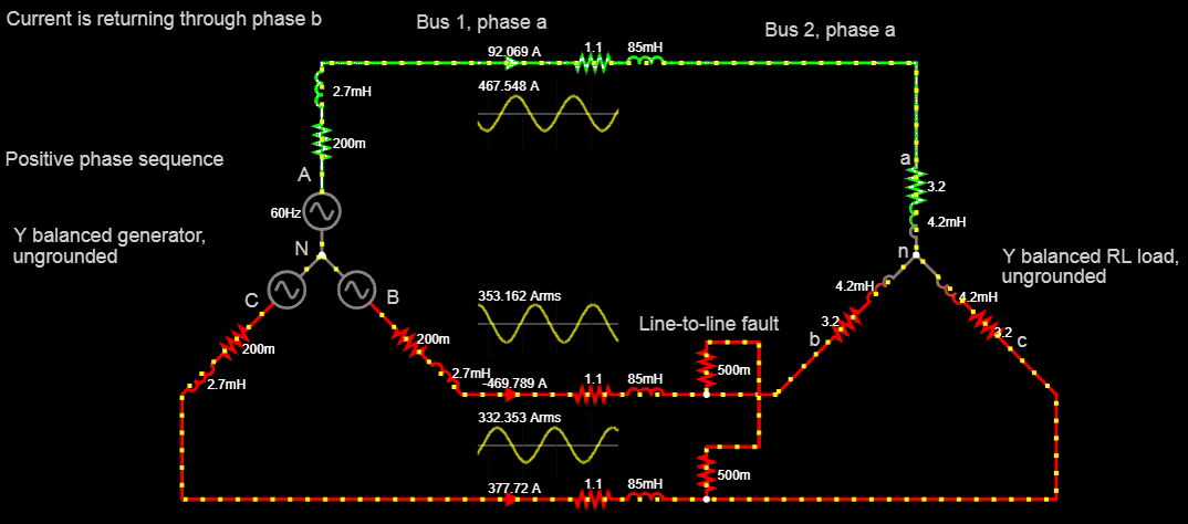 Малюнок 6. Незаземлений генератор зі збалансованою зіркою, незаземлене RL-навантаження зі збалансованою зіркою, нейтральний провід відсутня, міжфазне замикання на навантаженні.