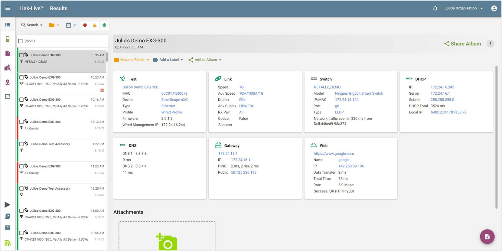 Екран: Це панель інструментів Link-Live Results, куди завантажуються всі результати тестування. Зліва відображаються результати з іменем пристрою, даними та часом тестування, а також типом тестування та будь-якими папками або мітками, застосованими до результату. Користувачі можуть переміщатися та отримувати доступ до інших функцій Link-Live за допомогою лівої панелі.
