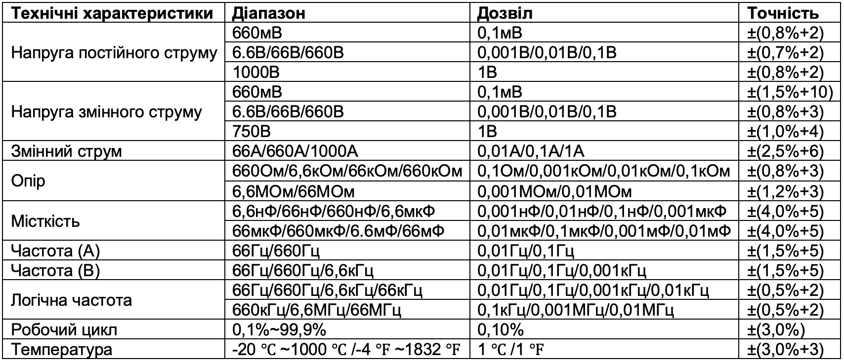 - Рівень безпеки: CAT III 1000 В / CAT IV 600 В