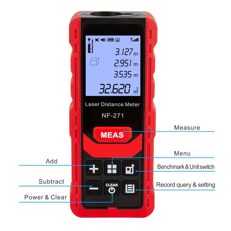 Особенностью лазерной линейки NF-271 является высокая точностью измерения расстояний и компактный размер, а также простота использования. Измерения можно выполнять как от верхней так и нижней кромки корпуса, имеется резьбовое соединение для установки на штатив. Все линейки серии NF-271 питаются от трех элементов ААА, звуковое подтверждение действий, память на 50 результатов измерений, автоматическое отключение лазера и полное отключение питания для экономии энергии аккумулятора.