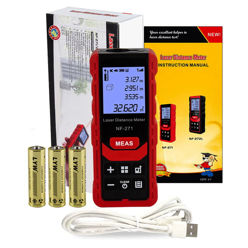 Особенностью лазерной линейки NF-271 является высокая точностью измерения расстояний и компактный размер, а также простота использования. Измерения можно выполнять как от верхней так и нижней кромки корпуса, имеется резьбовое соединение для установки на штатив. Все линейки серии NF-271 питаются от трех элементов ААА, звуковое подтверждение действий, память на 50 результатов измерений, автоматическое отключение лазера и полное отключение питания для экономии энергии аккумулятора.