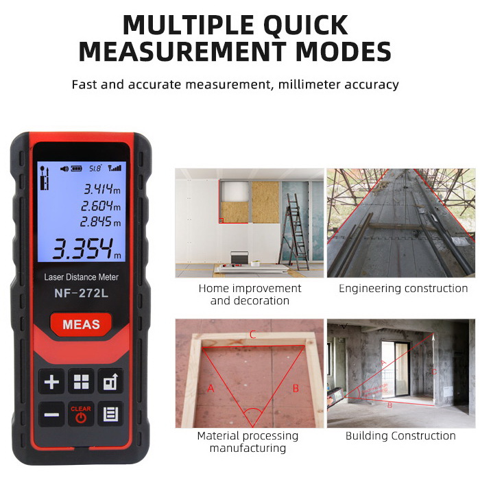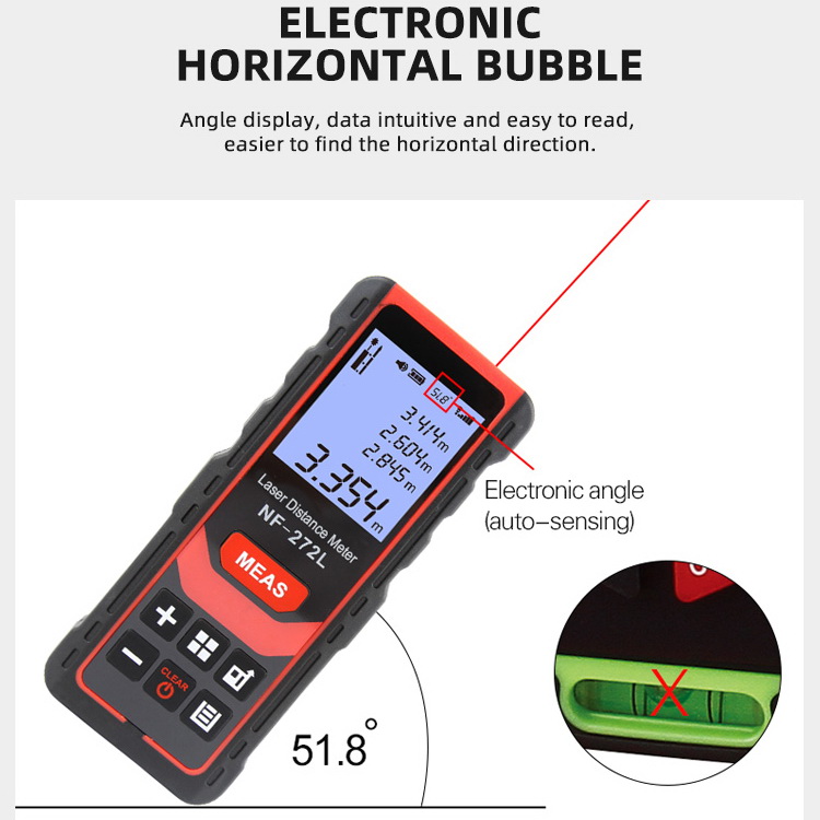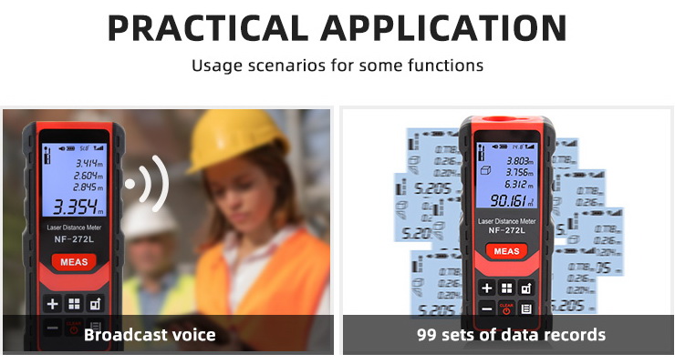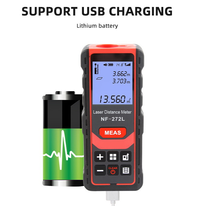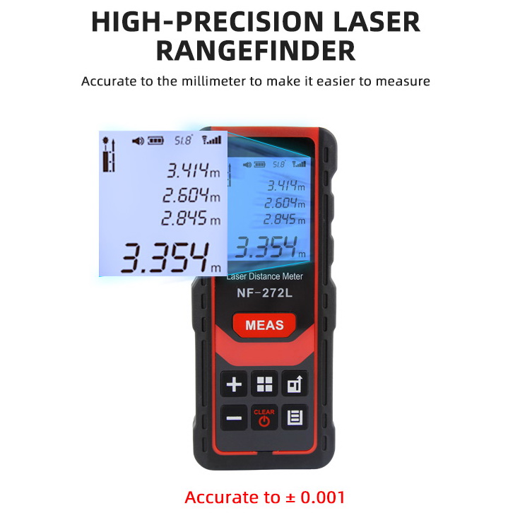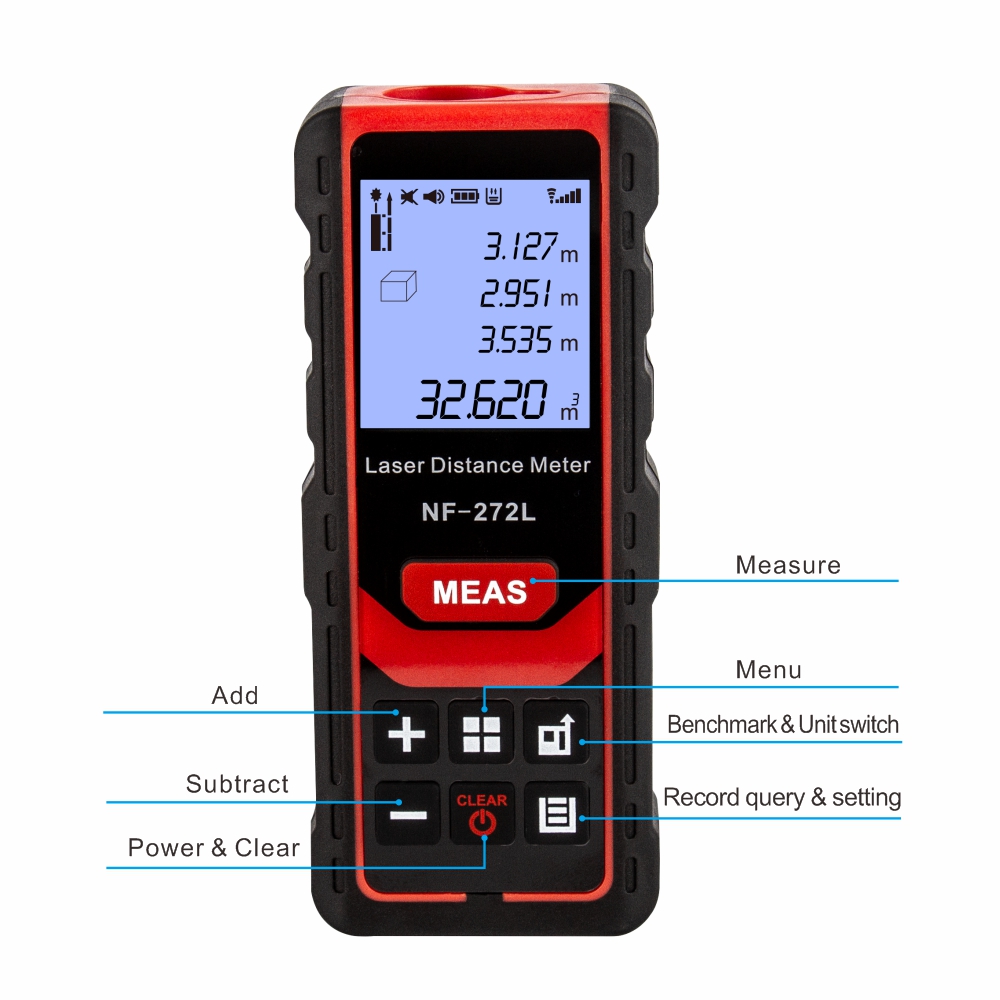 Особенностью лазерной линейки NF-272L является высокая точностью измерения расстояний и компактный размер, а также простота использования. Измерения можно выполнять как от верхней так и нижней кромки корпуса, имеется резьбовое соединение для установки на штатив. Все линейки серии NF-272L питаются от литиевой аккумуляторной батареи 3,7 В, 850 мА*ч с возможностью зарядки через USB-разъем, имеют встроенный bluetooth интерфейс, электронный угломер, голосовое озвучивание результатов измерений, память на 99 результатов, автоматическое отключение лазера и полное отключение питания для экономии энергии аккумулятора.