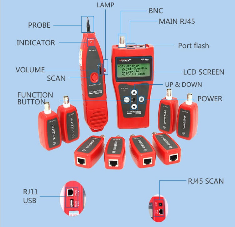 NF-388 – трасорозшукач фірми NOYAFA призначений для виявлення ліній типів RJ-45, BNC, RJ-11, USB, а також для пошуку несправностей у кабелях та з'єднаннях. Основні функції - це пошук та ідентифікація лінії, перевірка її стану, трасування, вимірювання довжини провідника до обриву (замикання).