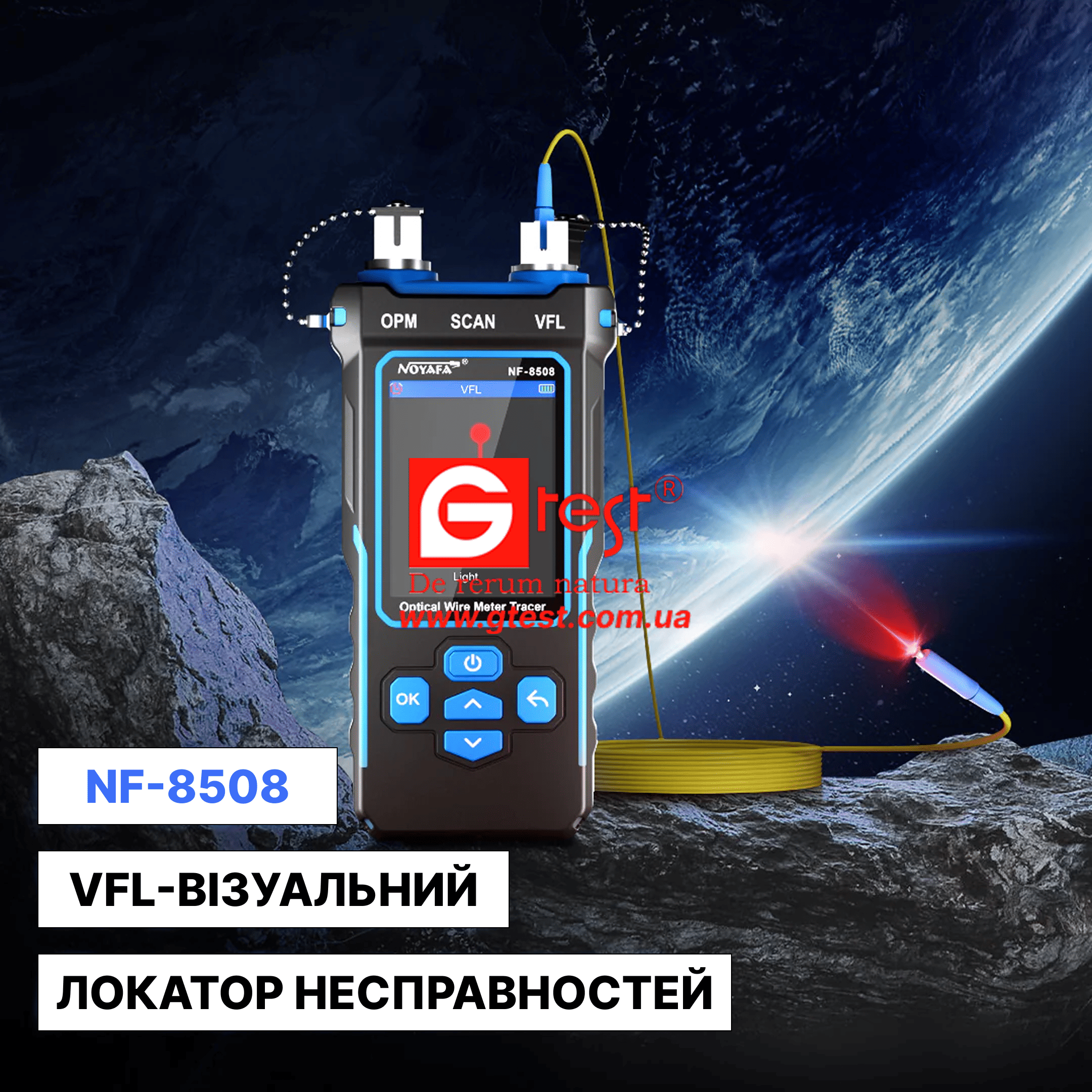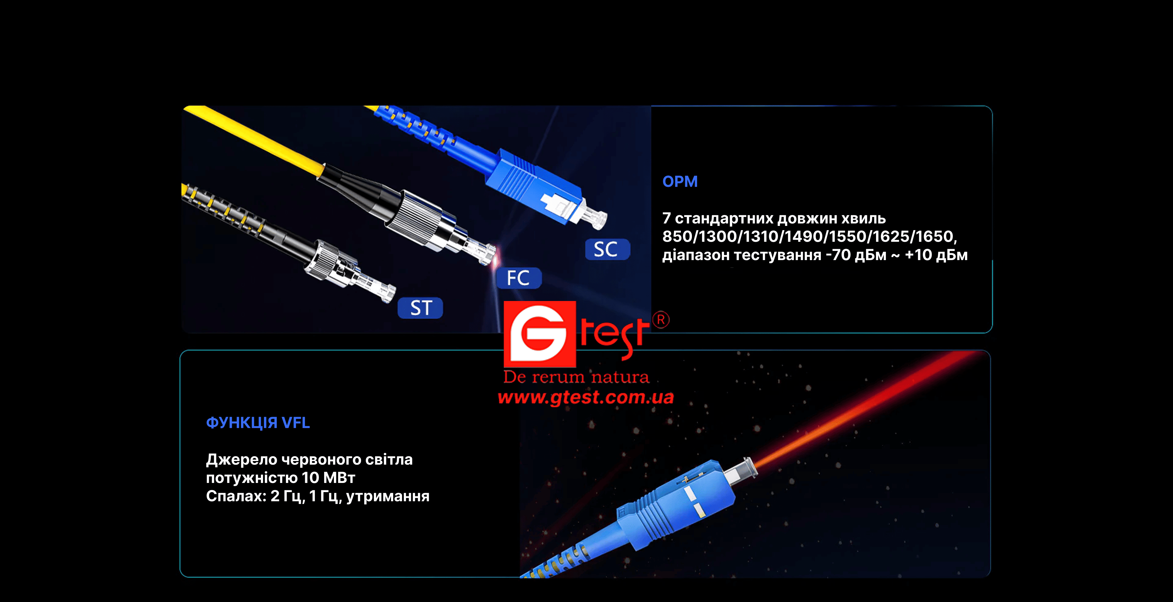 • Візуальне виявлення несправностей (VFL): використовує лазер потужністю 10 мВт з режимами швидкого спалаху, повільного спалаху та постійного світіння для трасування кабелю на великих відстанях та швидкого визначення місця обриву волокна.