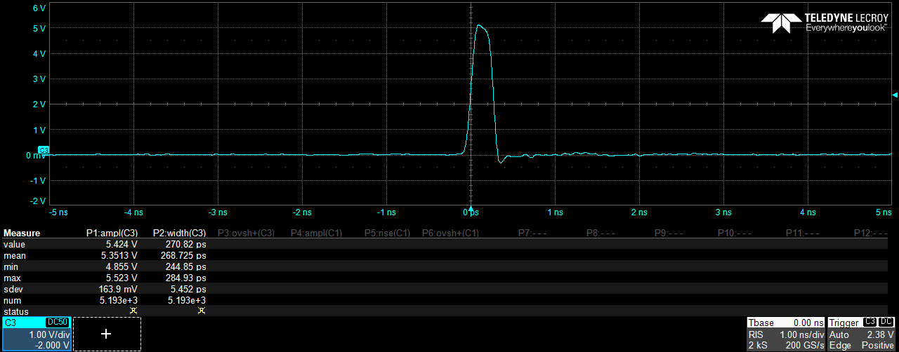 Щоб уникнути цієї проблеми, генератори імпульсів і цифрової затримки, розроблені Active Technologies, здатні забезпечувати час наростання швидше, ніж 70 пс, як це представлено на малюнку нижче.