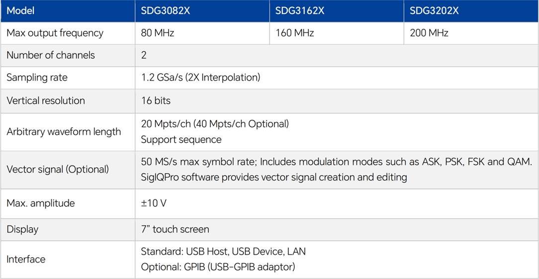 Двоканальні генератори сигналів функціональної/довільної форми серії SDG3000X мають максимальну смугу пропускання 200 МГц, відмінні характеристики системи дискретизації з частотою дискретизації 1,2 Гвиб/с і 16-бітною вертикальною роздільною здатністю, забезпечує генерацію шаблонів PRBS, послідовності, подвійних спектра потреб у додатках.