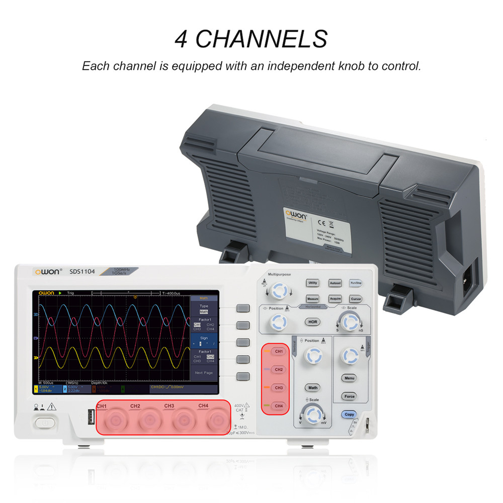 Осцилограф OWON SDS1104 із чотирма незалежними вимірювальними каналами забезпечує виняткову гнучкість при виконанні складних вимірювальних завдань. Така конфігурація дозволяє здійснювати одночасний моніторинг та порівняння отриманих результатів від кількох сигналів, що необхідно для дослідження, наприклад багатофазних систем, диференціальних сигналів або складних цифрових протоколів.