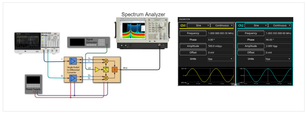 Визначте помилки підсилення та фази, регулюючи амплітуду та фазу одного каналу, доки небажана потужність бічної смуги не буде мінімізована. Різниця в налаштуваннях амплітуди та фази між каналами 1 і 2 дорівнює дисбалансу підсилення та квадратурній помилці.