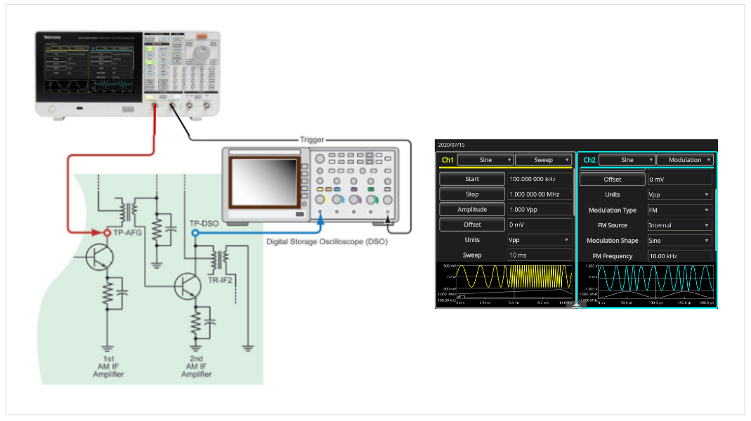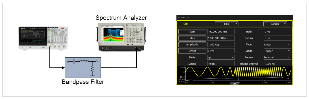 Якщо доступний лише осцилограф, а аналізатора спектра немає, запустіть початок розгортки через вихід тригера генератора, установіть часову шкалу осцилографа відповідно до часу розгортки генератора та інтерпретуйте її як значення частоти.
