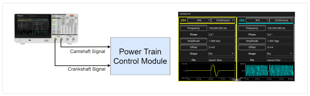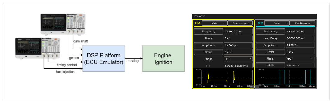 Імітація різних сигналів автомобільних датчиків, таких як тиск, температура, швидкість, обертання та кутове положення для функціонального тестування та оптимізації блоків керування двигуном (ECU) для автомобільних застосувань.