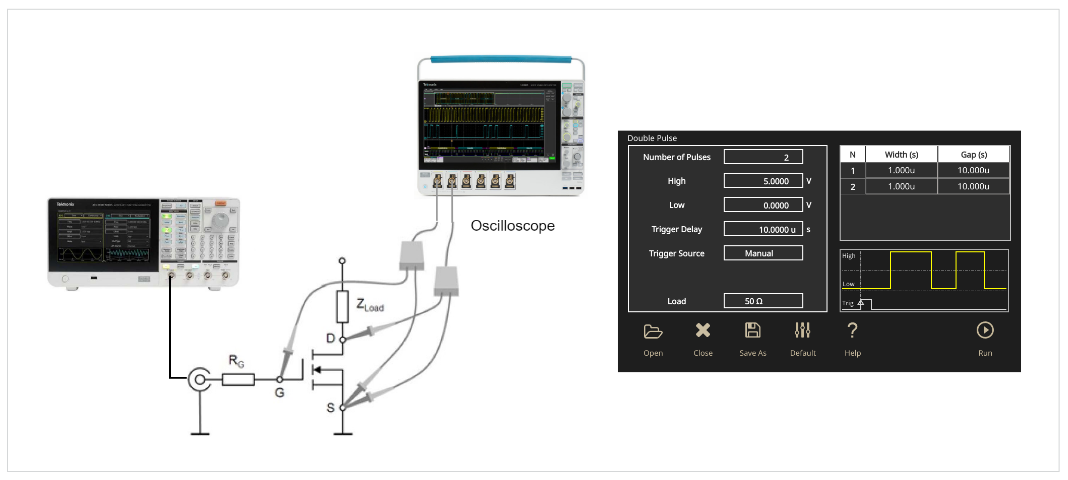 Вбудована програма Double Pulse для серії AFG31000 скорочує час налаштування тесту. (Для отримання додаткової інформації про програму Double Pulse див. примітку до програми за адресою https://www.tek.com/document/application-note/double-pulse-test-tektronixafg31000-arbitrary-function-generator.)