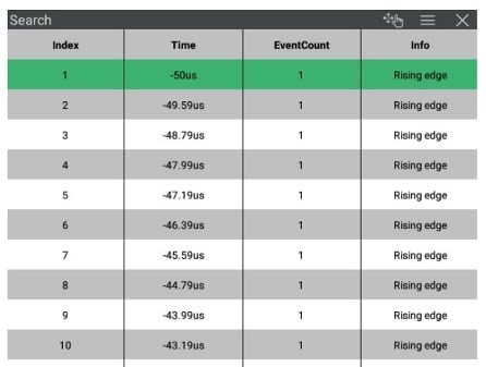 Можливість пошуку та маркування подій через певні параметри необхідна для більш складного налагодження. У поєднанні з режимами візуалізації високої роздільної здатності дані налагодження та чіткої візуалізації містять особливо корисну інформацію. На рис. 5 показаний приклад того, як виглядатимуть результати пошуку, якщо було здійснено налаштування наростаючих фронтів. А інтелектуальний запуск гарантує, що рідкісні та важливі події, що становлять інтерес, обов'язково будуть збережені без включення непотрібних даних, що призведе до отримання більш короткої та корисної інформації.