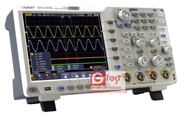 OWON XDS3204AE, 4 канали, 200 МГц, 1 Гвиб/с, 8 біт, глибина пам'яті 40 Мвиб, інтерфейс VGA та кольоровий сенсорний дисплей 8 дюймів. Декодування CAN, I2C, SPI RS232.