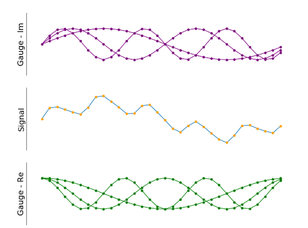фазі на 90 градусів у порівнянні із зеленими сигналами (реальна частина), як і