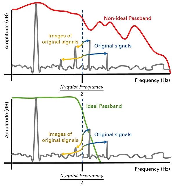 Осцилографи з поганими характеристиками зниження амплітуди сигналу згідно з правилом -3 дБ дозволяють певним сигналам, що знаходяться за межами робочого діапазону частот, помилково з'являтися в спектрі поточних вимірювань.