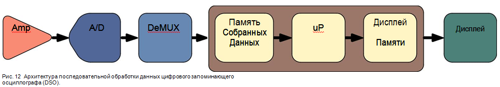 Деякі підсистеми у складі DSOs схожі на ті ж, що є в аналогових осцилографах. Однак, DSOs мають додаткові підсистеми обробки даних, що задіяні для їх збирання та відображення всієї форми сигналу. Осцилограф DSO побудований на архітектурі послідовної обробки даних для захоплення та відображення сигналу на екрані, як це представлено на рис. 12. Опис такої архітектури наводиться нижче.