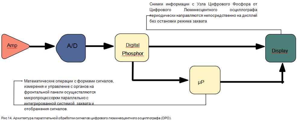 У той час як DSO задіює архітектуру послідовної обробки сигналів для їх захоплення, відображення та аналізу, то DPO має паралельну архітектуру для реалізації тих же функцій, як це представлено на рис 14. Архітектура DPO має унікальне апаратне забезпечення на спеціалізованих інтегральних схемах (ASIC) захоплення картинок форм сигналів з високою швидкістю, що забезпечує високий рівень їхньої візуалізації. Така функціональність підвищує ймовірність захоплення різноманітних перехідних подій, що мають місце в цифрових схемах, як то пульсуючі імпульси, збої та помилки переходу, що розширює можливості для аналізу. Опис такої архітектури паралельної обробки даних наводиться нижче.