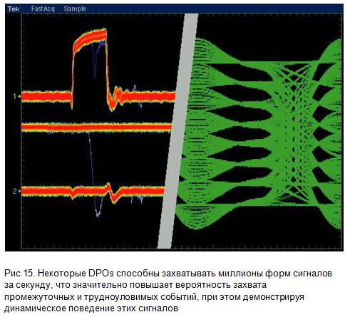 Осцилограф DPO ідеальний для тих, хто потребує найкращого інструментарію загального призначення та налагодження у багатьох областях застосування, як це представлено на рис. 15. DPO – найкращий прилад для здійснення складних аналізів, тестування з комунікаційних масок, налагодження цифрових схем від паразитних сигналів, аналізу цифрових сигналів, що повторюються, та застосувань в областях синхронізації.
