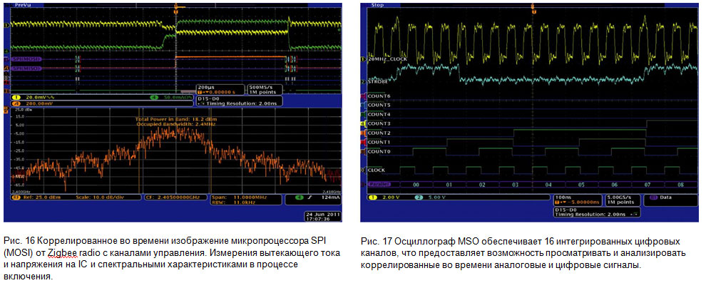 Розуміння такого параметра як тимчасова затримка між командою мікропроцесора та РЧ подією в рамках РЧ схеми спрощує тестові налаштування та трансформує процедури складних вимірювань у звичайні процеси. Що стосується вбудованого радіо, наприклад, розробка Zigbee, показана на рис. 16, то можна налаштувати запуск пускової схеми приладу на появи РЧ події та переглядати латентність командного рядка мікропроцесорного контролера, декодовані командні рядки SPI, струми стоку та напруги в процесі запуску РЧ події, а також всі спектральні події як результат всього цього. На єдиному дисплеї тепер представлені корельовані у часі події на всіх доменах радіо: протокол (цифровий), аналог та РЧ.