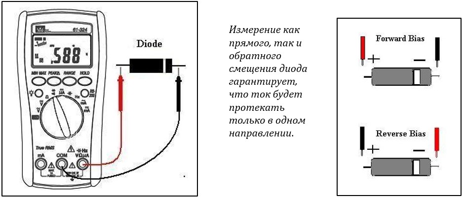 Діод це напівпровідниковий прилад, який дозволяє струму текти тільки в одному напрямку. Стандартна функція Ом на цифровому мультиметрі не забезпечує достатньо енергії для перевірки діода. Функція діода прикладає відповідну кількість тиску (або потенціалу напруги) та вимірює падіння напруги на діоді.