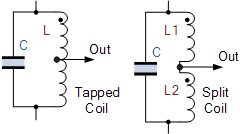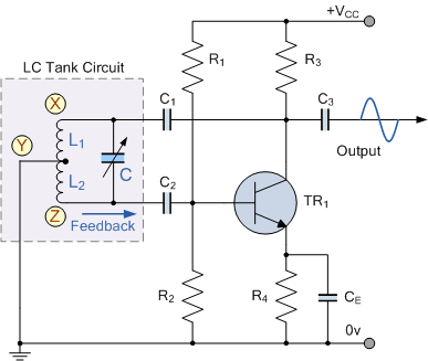 Частина зворотного зв'язку налаштованого ланцюга LC-резервуару береться від центрального відведення котушки індуктивності або навіть двох окремих котушок, включених послідовно, які включені паралельно з конденсатором змінної ємності C, як показано.